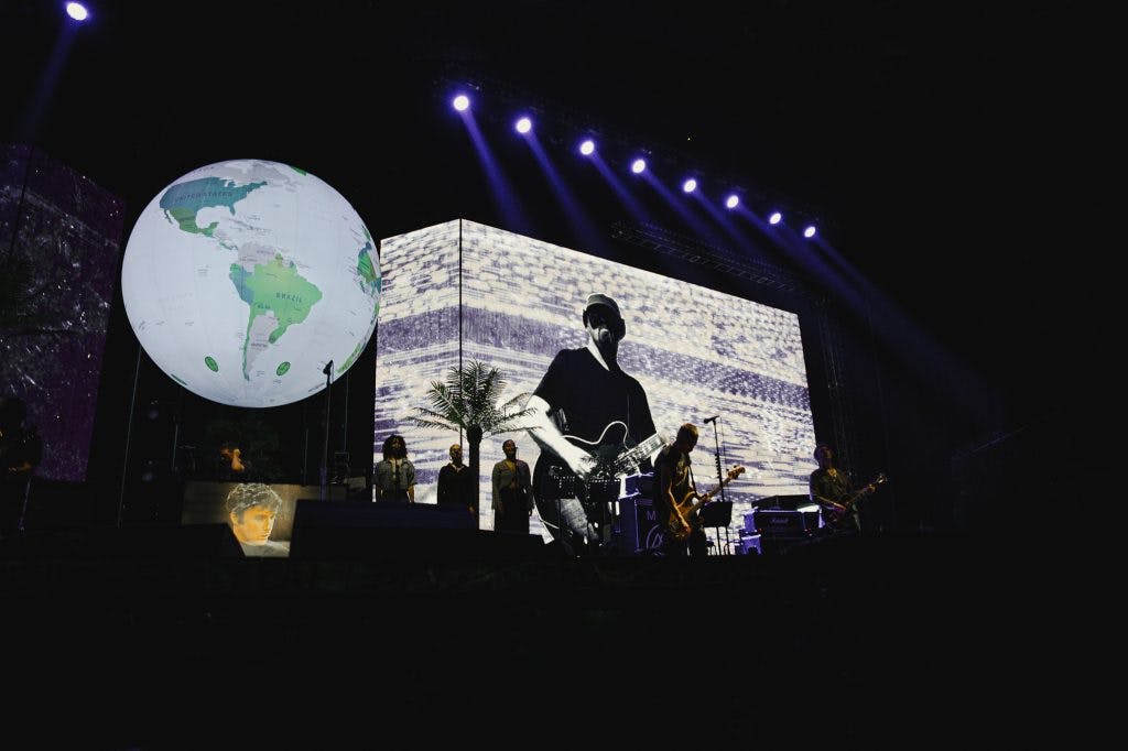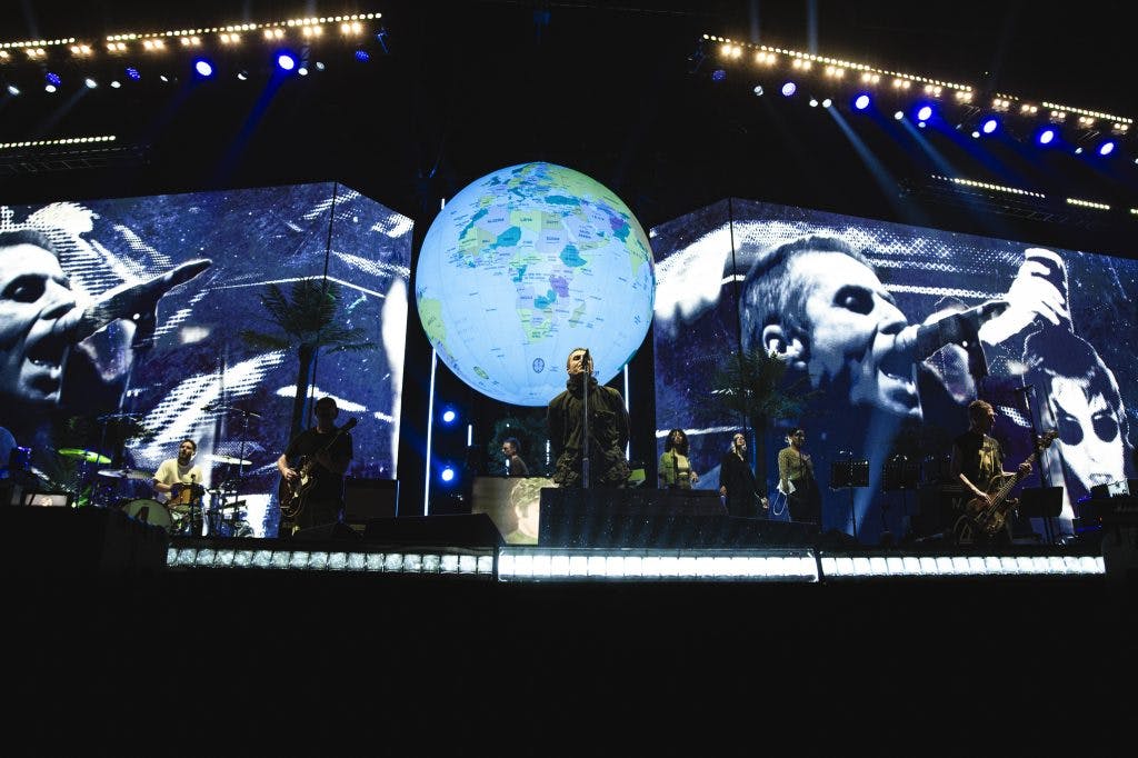 Visually, the concert was a feast for the eyes, which was noticeably a massive step up from previous Liam Gallagher solo tours. Featuring a huge spinning globe, lifelike flamingo sculptures, palm trees and how could we forget “LASAGNE” in gigantic letters during Digsy’s Dinner accompanied by a tribute to original drummer Tony McCarroll on the big screens. The backdrop of nostalgic visuals added an extra layer of immersion, making the night not just a concert but a vibrant journey through time.
