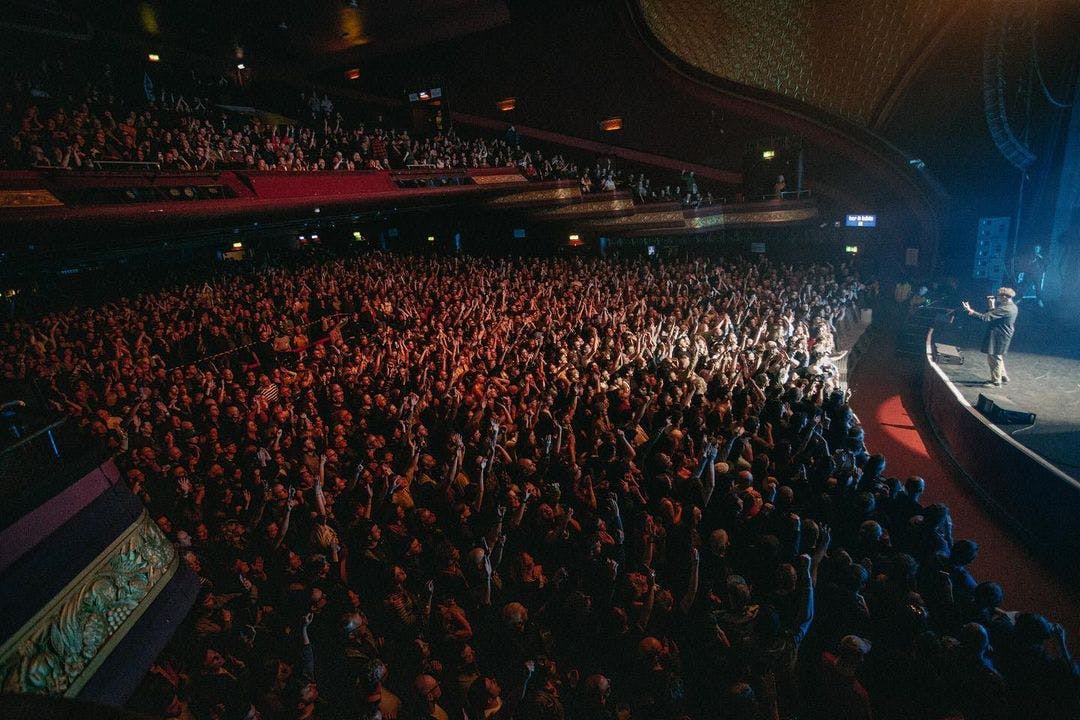 ‘We Make Hits’, the track that pens the Yard Act origin story, was next: about how Needham and Smith, ‘two broke millennial men’, formed a creative partnership that sparked the beginnings of this larger-than-life band. Smith sang his introduction to Needham with his arms wrapped around his shoulders, “And this is my best friend in the world!”. ‘Down by The Stream’ offers a bit of respite before ‘Dream Job’ that unites fans both old and new as their most popular hit from the new album. People mimic the corresponding gestures to the Northern adlibs of approval (that are the iconic dance moves out of the music video).